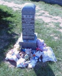 The expedition is a family tradition for Ma and me – a trip to the Titanic plot in the Fairview Cemetery. We wander down the outer paths but Finn hangs back. He doesn’t want to go near the marker for the unknown child. The one with all the toys. They’re soaked in rain and dust so they don’t interest me but visitors have left them for Finn. I go on without him and he calls from a long way off to come back or he’ll give me a smack so he will. I pick up a teddy bear for the unidentified child and tuck it under my arm to give to Finn.