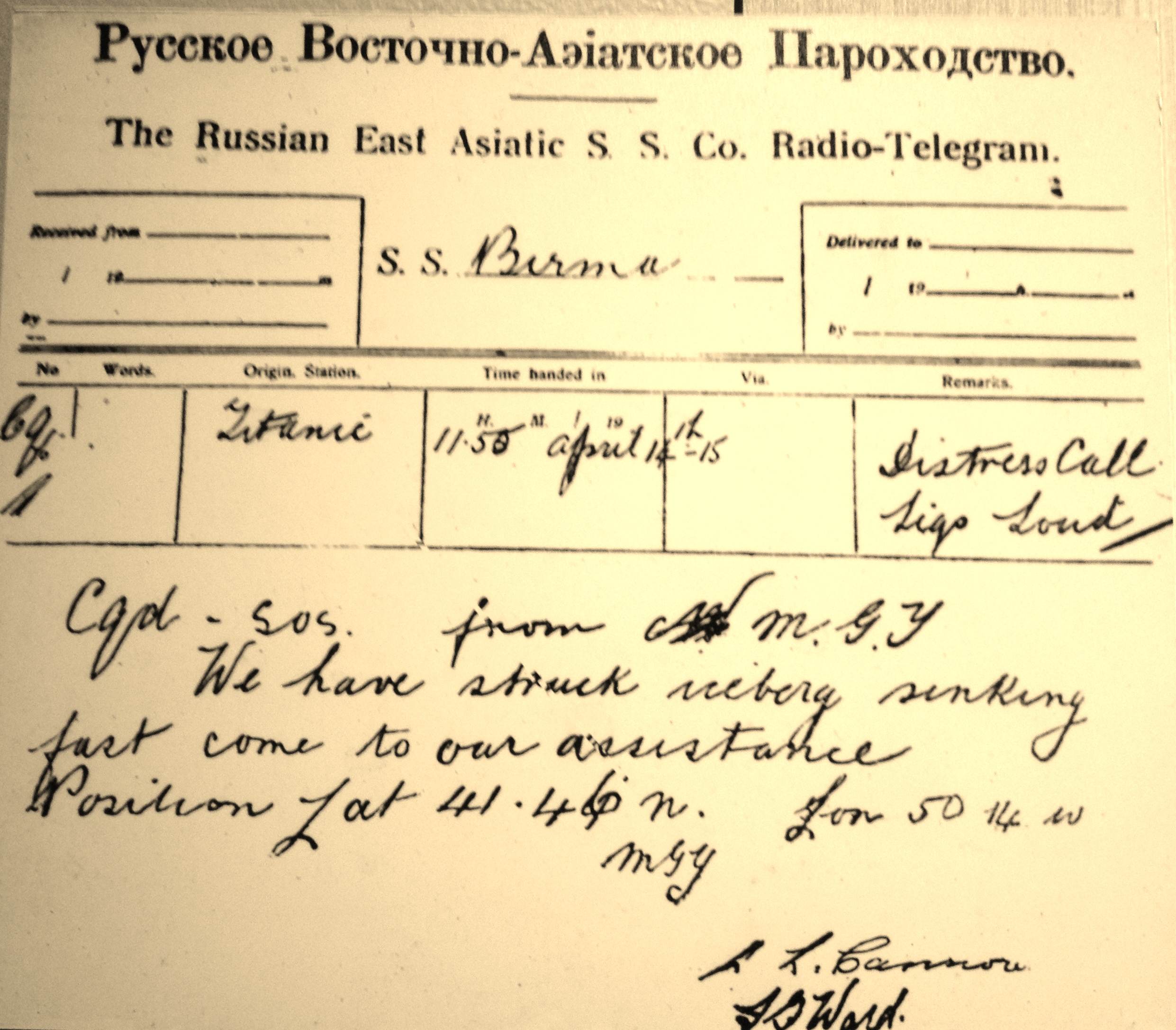 Countdown, two hours ten minutes April 14, 1912 ten minutes to midnight – TITANIC’s side scrapes the iceberg. Small chunks of ice land on the decks. At first they’re a novelty and used as ice cubes in drinks… When the damage is assessed as fatal, RMS Titanic sends up flares and the first S.O.S. ‘marconigram’. A series of frantic messages continue. S.O.S. – SAVE OUR SOULS!