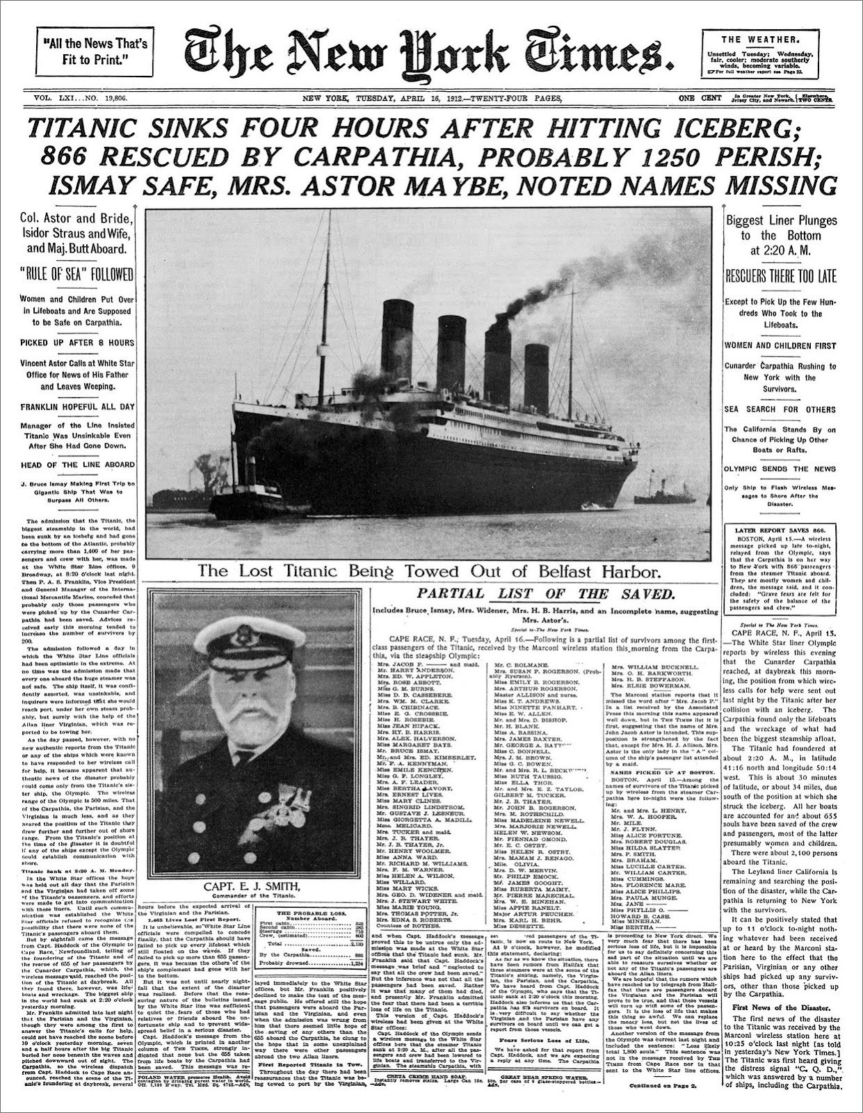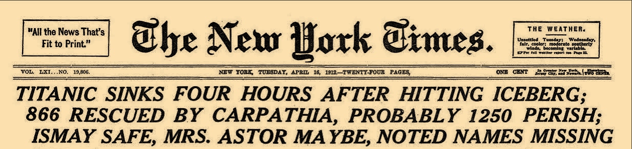 Odd words for a reporter; PROBABLY? MAYBE? Yet a noted member of the elite New York society was singled out for mention in the headline along with the owner of the White Star Line. PRIORITIES. The New York Times motto: ‘all the news that’s fit to print’.