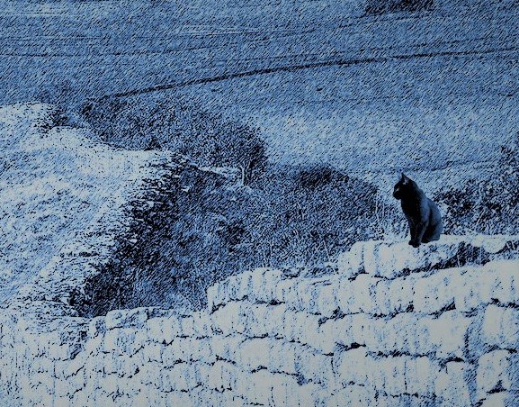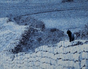 This is Anubis, on evening watch for pesky intruders. The wall is the Roman Emperor Hadrian’s 80 mile building project c. A.D. 122 who thought it would keep out the Scots (silly man)