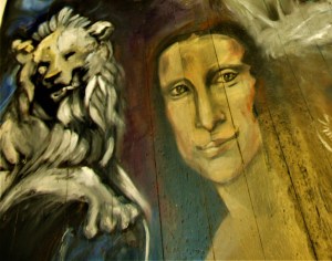“SPEAK FOR YOURSELF,” I said to the ‘Mona Lisa’: And so it was, when I was stuck writing a prologue for ‘Lisabetta’, the story of Leonardo da Vinci’s kid sister, she interrupted me in a pique of broken English. Without hesitation, I got out of her way and gave her the floor, so to speak (this image is one of my ‘floorals’, so named by me for a mural painted on a floor). “Okay, go for it,” I said. “I’ve lost the plot. You were there. I’m just making it up as I go along.”