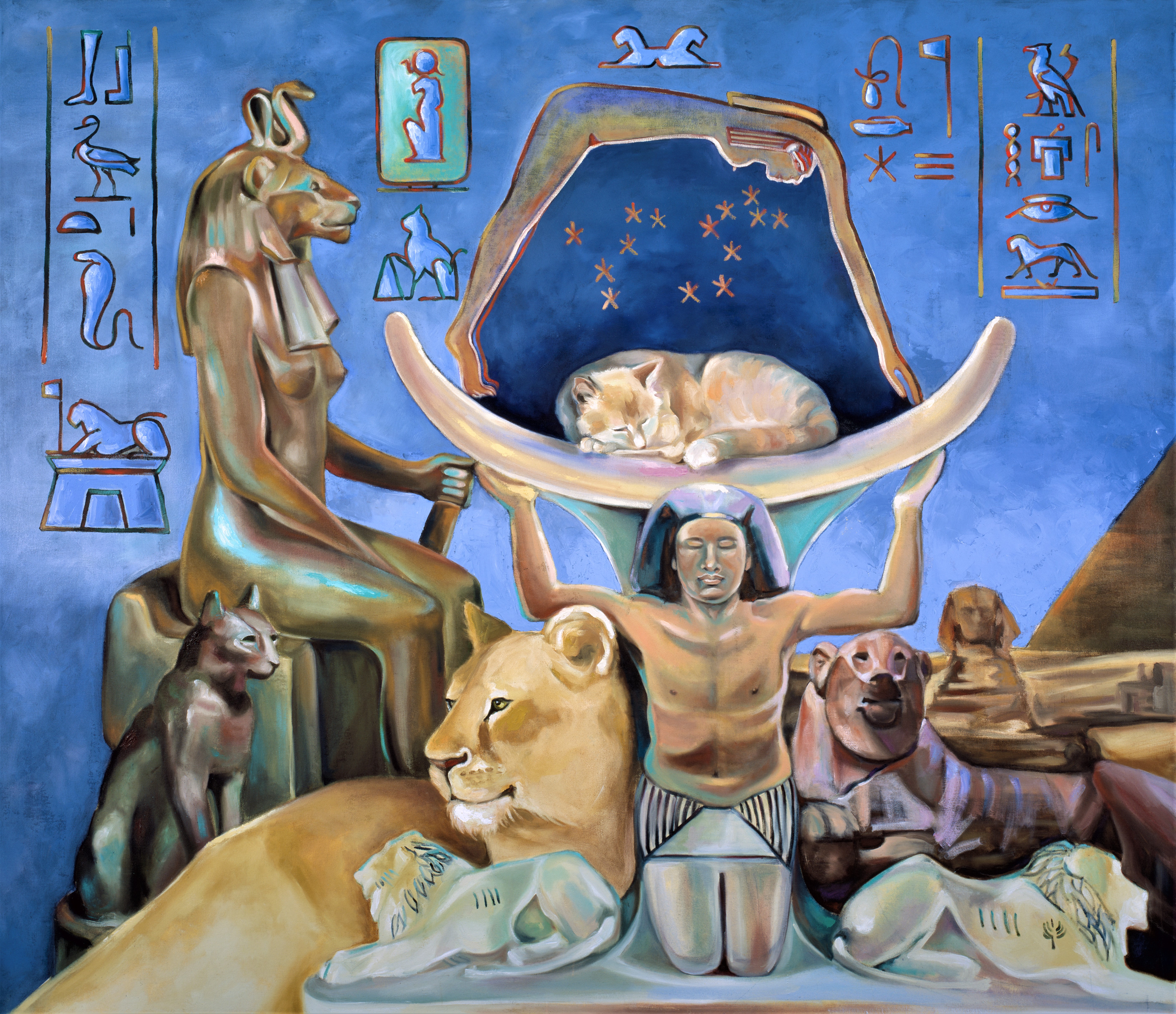 The alabaster pillow found in the teenager, King Tutankhamun’s, tomb (depicted in the painting, although I have shown the top half of the ka figure coming to life) was similar to the Great Pyramid of Giza in that it was a story recorded in stone. The deceased’s ka (we call them ghosts) is represented by a male figure holding both his arms over his head, as if, I like to think, he’s carrying the thoughts of the sleeper.