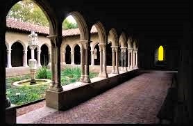 CLOISTER OLD: a covered walkway or tunnel-like hall, typically with a wall on one side and a colonnade open to a quadrangle on the other (we wish). A religiously observed harbour where initiates must live away from the world, required internment.