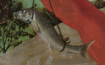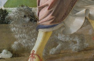 Master artists develop clear forensic signatures that reveal their creative presence at first sight. Leonardo da Vinci’s input to this blatantly flawed group painting are its saving grace. Experts on the specific forensics of Leonardo have settled on three areas that telegraph ‘Leonardo was here’: the sparkling fish, the boy’s windblown hair, and first prize – the ghostly dog, disappearing from one of Leonardo’s early misadventures with mixed media. (case in point: ‘The Last Supper’ and its infamous ongoing mishap with an untried plaster recipe)